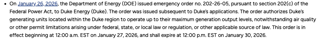 A similar situation occurred in the summer of 2025 during a heatwave at the end of June, when Duke Energy submitted a request to the DOE for an emergency order that authorized Duke to exceed emissions limits.
