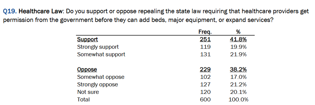 Another baffling area was when we asked whether health providers should have to get approval from a government board in order to justify buying new equipment or adding new capacity. Those strongly opposed to getting rid of these “certificate of need” laws (at 21.2%) outnumbered those strongly in support of repealing them (19.9%). Overall support (at 41.8%) was slightly higher than overall opposition (38.2%), but it was about even on what should be an obvious answer — get rid of these outdated, counterproductive regulations, now.