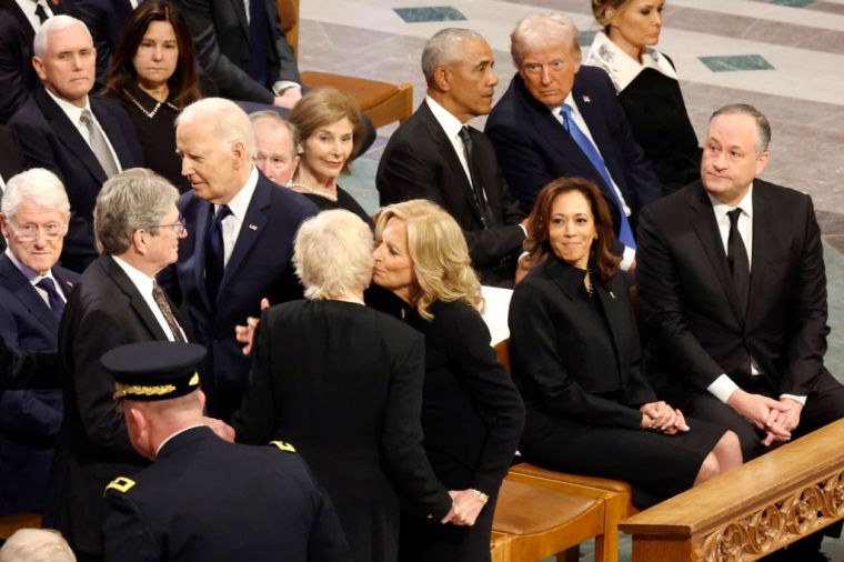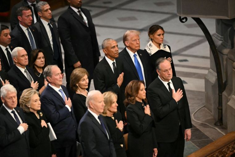 From L to R, first row, US President Joe Biden, First Lady Jill Biden, Vice President Kamala Harris, Second Gentleman Doug Emhoff, second row, former President George W. Bush, his wife Laura Bush, former President Barack Obama, President-elect Donald Trump and his wife Melania Trump attend the State Funeral Service for former US President Jimmy Carter at the Washington National Cathedral in Washington, DC, on January 9, 2025. (Photo by Mandel NGAN / AFP) (Photo by MANDEL NGAN/AFP via Getty Images)