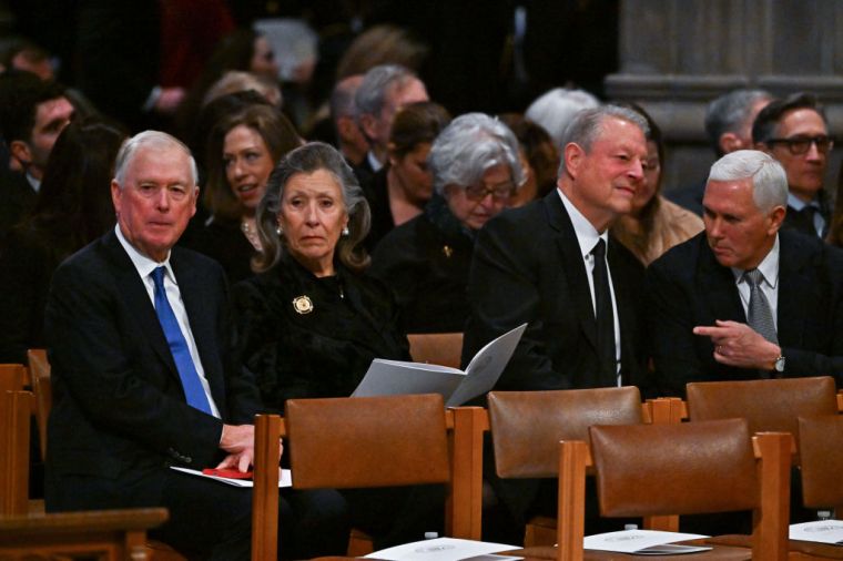 (L-R) Former US Vice President Dan Quayle, his wife, Marilyn Quayle, former Vice President Al Gore, and former Vice President Mike Pence attend the State Funeral Service for former US President Jimmy Carter at the Washington National Cathedral in Washington, DC, on January 9, 2025. (Photo by Ricky Carioti / POOL / AFP) (Photo by RICKY CARIOTI/POOL/AFP via Getty Images)