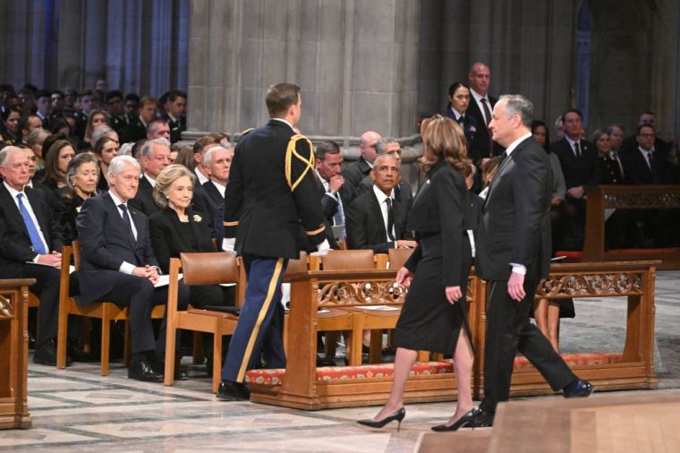 US Vice President Kamala Harris speaks with Second Gentleman Doug Emhoff (front row) as, from L to R, second row, former President Bill Clinton, former Secretary of State Hillary Clinton, former President George W. Bush, his wife Laura Bush, former President Barck Obama, President-elect Donald Trump and his wife Melania Trump look on during the State Funeral Service for former US President Jimmy Carter at the Washington National Cathedral in Washington, DC, on January 9, 2025. (Photo by ROBERTO SCHMIDT / AFP) (Photo by ROBERTO SCHMIDT/AFP via Getty Images)